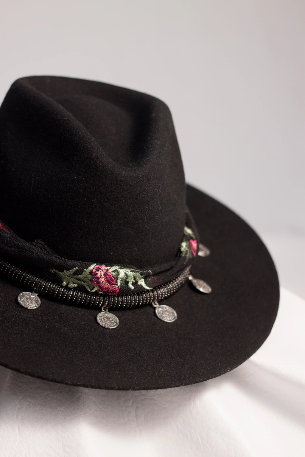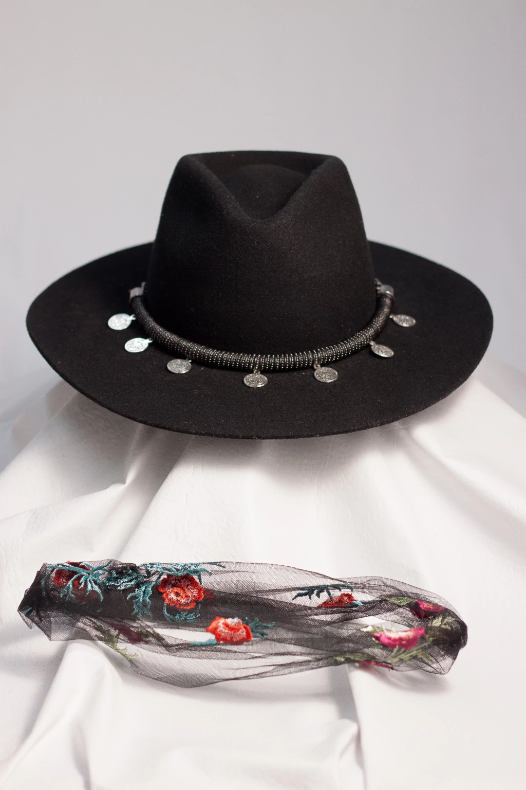 No modelo Fedora em Lã de Alpaca, o chapéu Andara tem lenço em tule bordado e corda embalada com fio de couro e corrente e medalhas Gypsy. Possui carnal (acabamento interno) também em couro