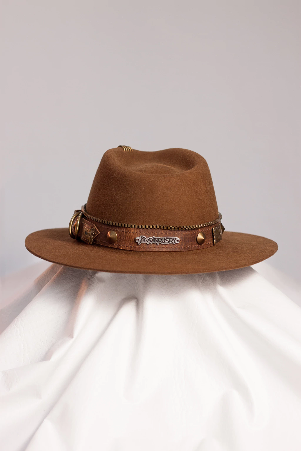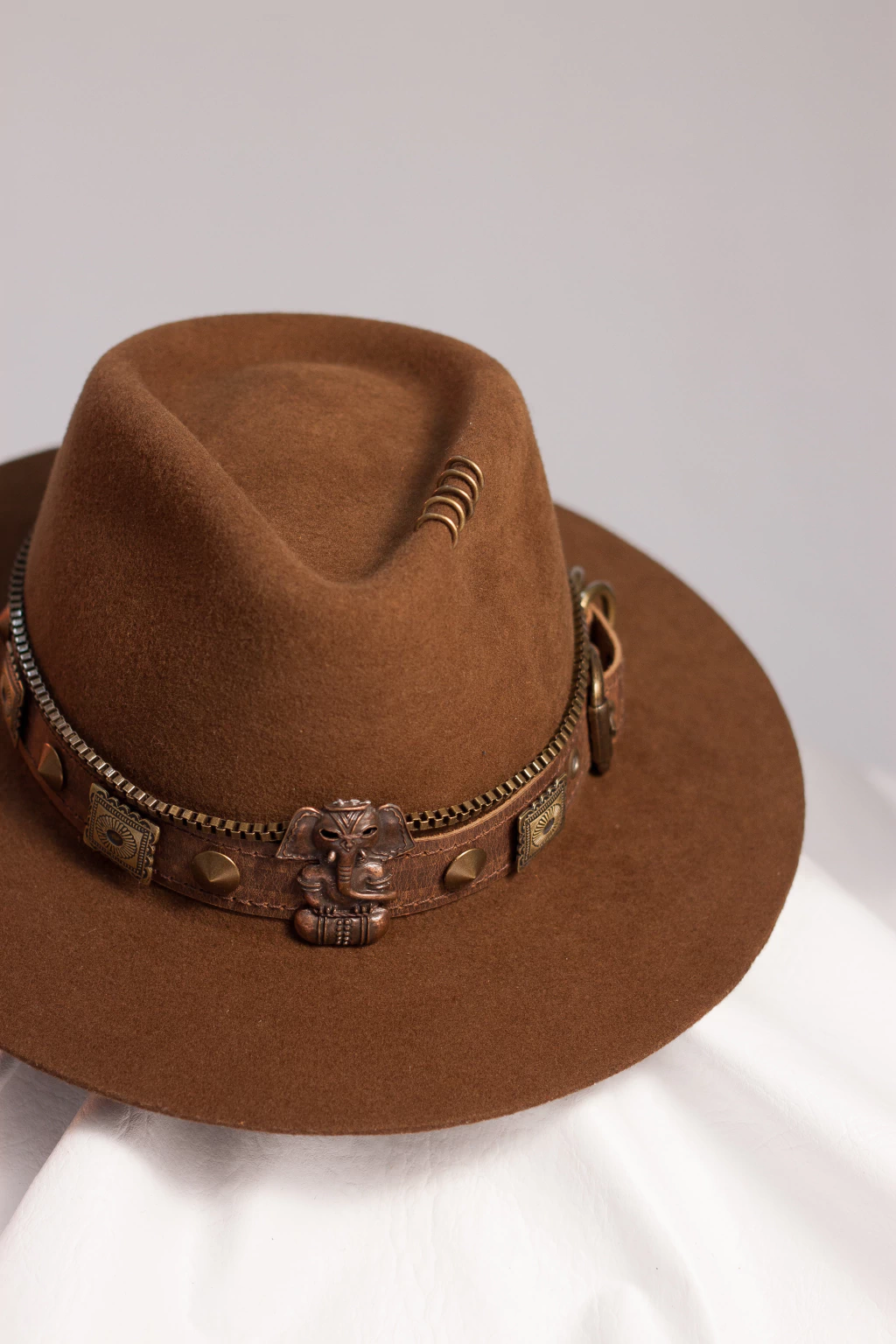 Modelo Fedora em Lã de Alpaca, o chapéu Ganesh tem banda em couro marrom fóssil com medalhas e fivela, com aplicação de Ganesh especial com banho cobre. Super único! Possui carnal (acabamento interno) também em couro