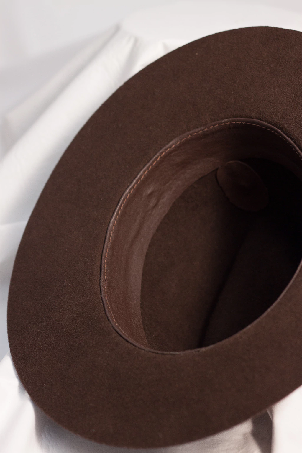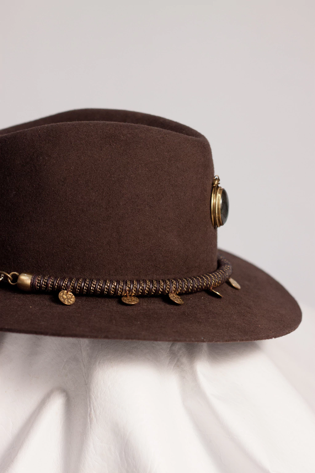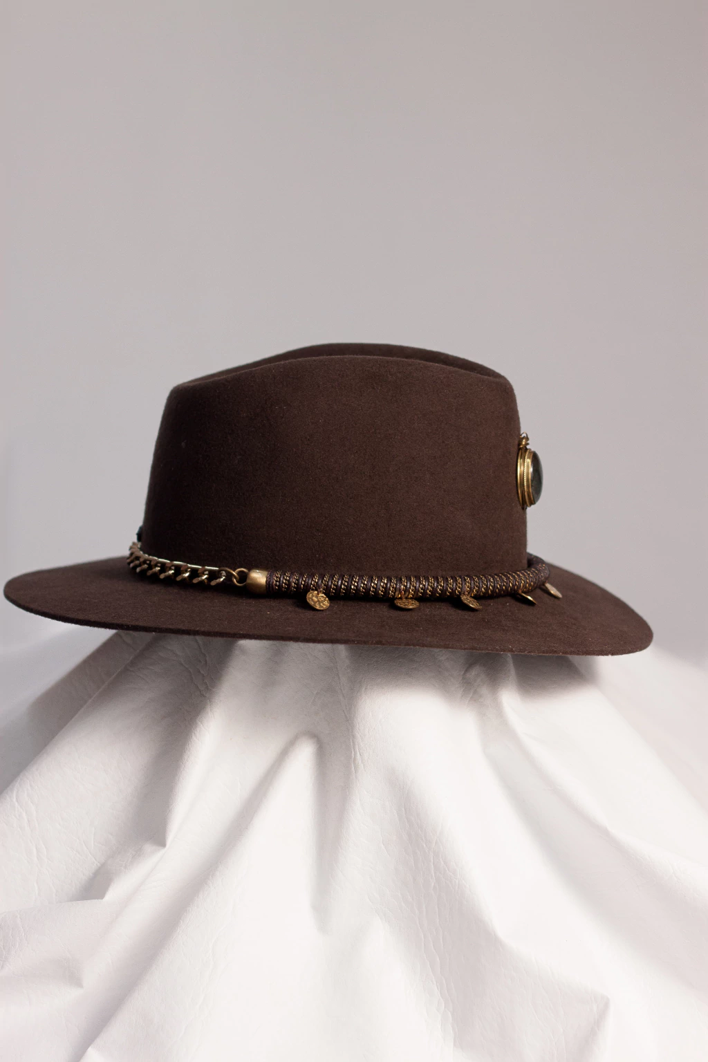 No modelo Fedora em Lã de Alpaca, o chapéu Gypsy Soul tem incrustação de cristal Labradorita com acabamento em Brás indiano e cordão embalado com fio de couro e corrente. Possui carnal (acabamento interno) também em couro